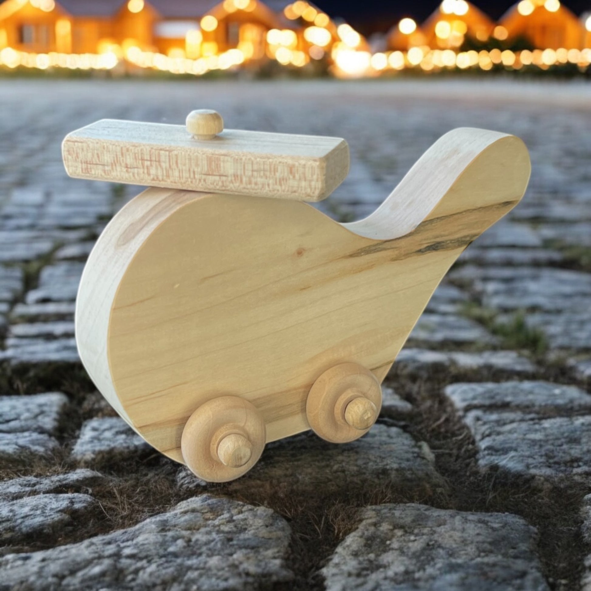 Handmade helicopter with movable propeller and fully functional wheels.